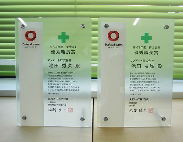 大和リース蒲lより、2021年安全大会にて大阪本店から池田秀次、京都支店から池田友弥が優秀職長賞を受賞しました。